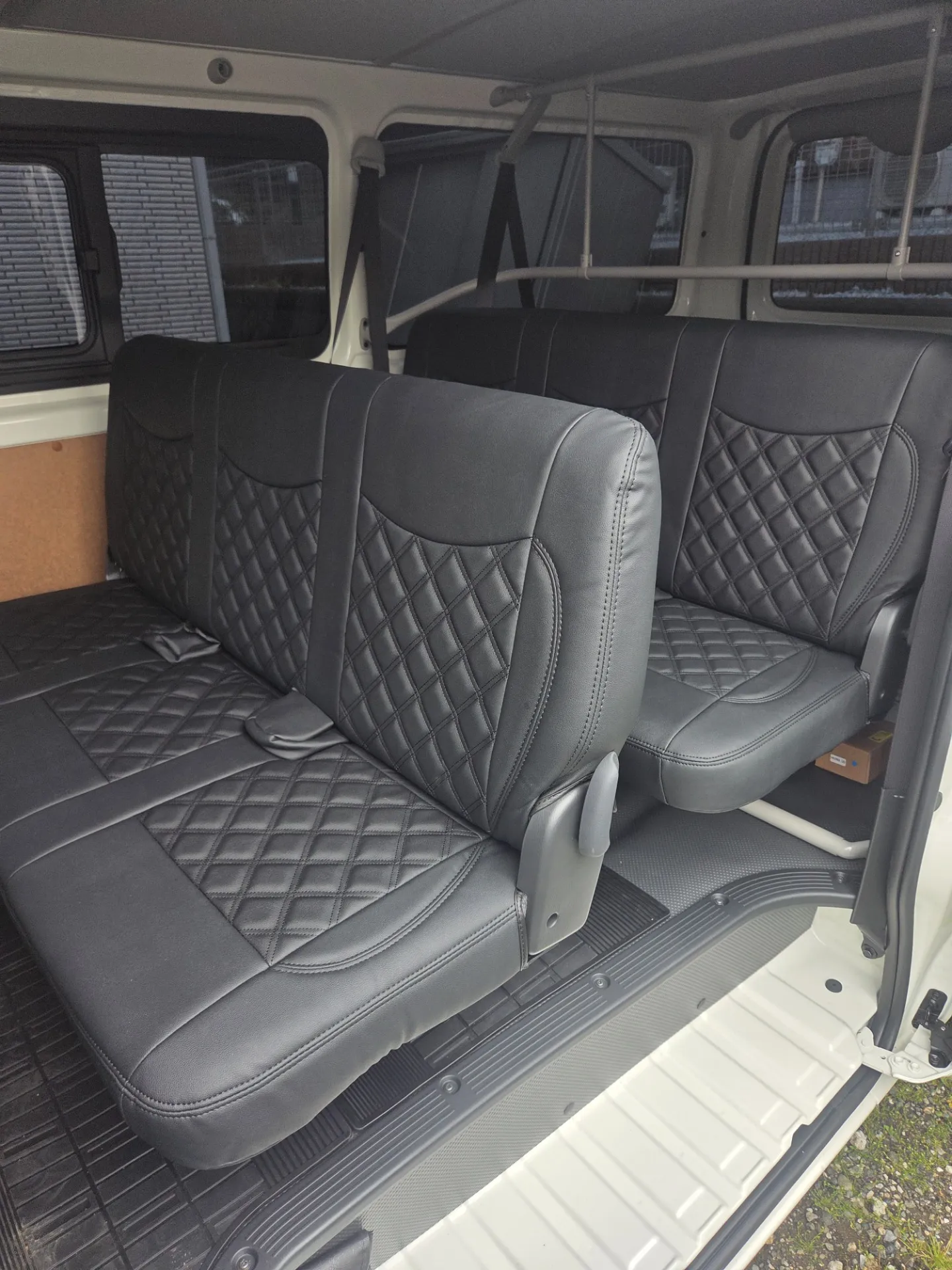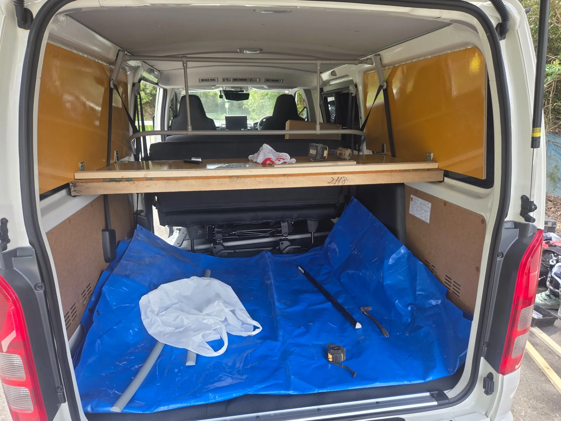 ハイエースを3月に納車し(8型です。涙)とうとう始動します。その前の段取りで、シートカバー装着。荷台の棚 作成!